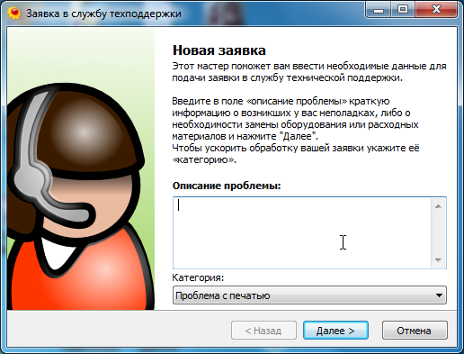 - вызов диалога подачи заявки в службу техподдержки.