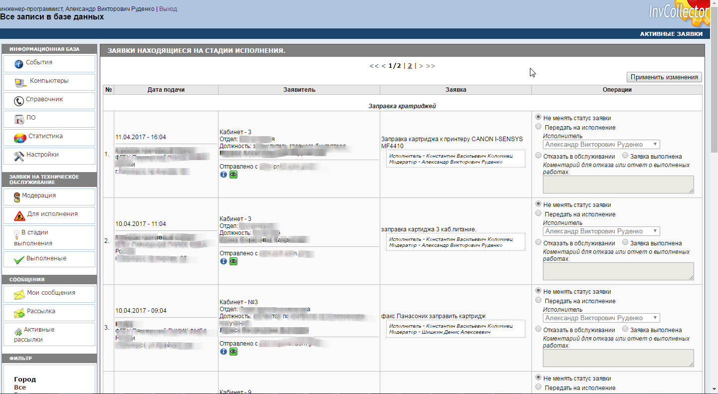 Пункты «В стадии выполнения» и «Выполненные» позволяют администраторам системы просматривать текущие и выполненные заявки.